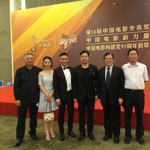 电影《难忘的岁月》剧组红毯嘉宾合影,左起导演史凤和、于若木扮演者吴竹青、陈云扮演者刘冠翔、毛泽东扮演者佟瑞欣、出品人徐建平、出品人周丕学。