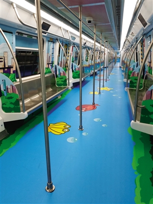 同时,为了适应超长距离乘车的舒适性,让市民出行拥有更多选择,11号线还特别设置了2节商务车厢,共安装了112个沙发软座,采用2+2式布局。座椅底部为架空结构,可放置小件行李,大件行李则有专设位置;车厢顶部是具有蓝天白云效果的顶灯,脚下是泛起点点水花的蓝色地板。同时,为了防止列车在高架段运行时阳光对车内乘客的影响,车厢窗户还特别安装了遮阳帘。