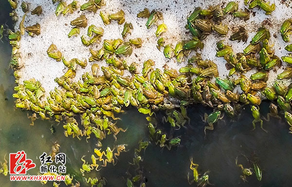 养殖的青蛙。红网新化站6月27日讯(分站记者 黎明明 李伊超 通讯员 鄢金玉)“稻花香里说丰年,听取蛙声一片”,有蛙的叫声,农民就有播种的希望、收获的喜悦!湖南省新化县有着几个年轻人,在全国“大众创业,万众创新”的滚滚浪潮中,采用青蛙仿原生态喂养法,开始了黑斑蛙的养殖,有效解决农田抛荒及村民就业问题。
