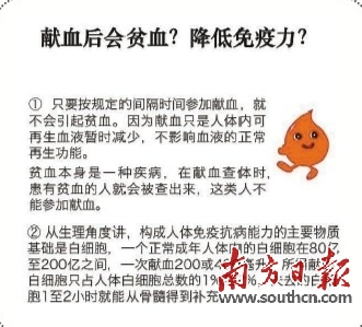 1)只要按规定的间隔时间参加献血,就不会引起贫血。因为献血只是人体内可再生血液暂时减少,不影响血液的正常再生功能。