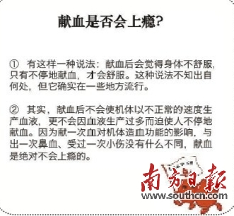 1)有这样一种说法:献血后会觉得身体不舒服,只有不停地献血,才会舒服。这种说法不知出自何处,但它确实在一些地方流行。