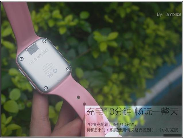 后置充电口设计,实际测试支持5V,1.1A充电效果,基本上可以再1小时内充满(正常的儿童手表大约是5V,0.2A充电效果,差不多2小时左右充满),
