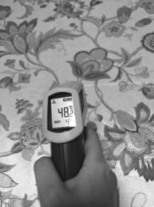 测试步骤:让放置了热水袋的区域冷却一分钟后,随即再测量该区域的降温温度。