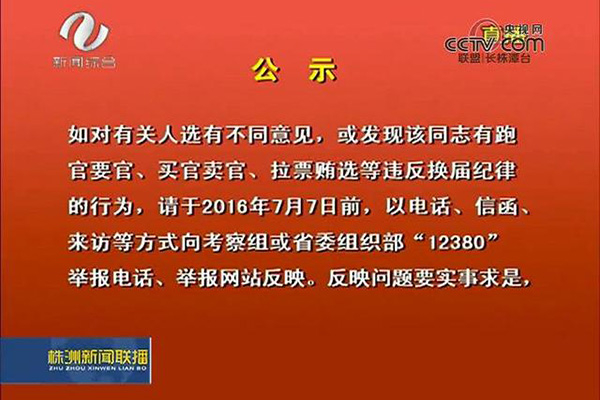 7月1日,省委赴株洲市干部考察组发布株洲市领导班子换届人选考察对象公示名单。