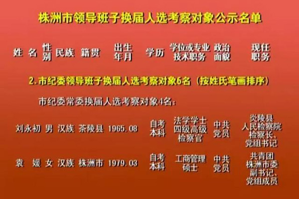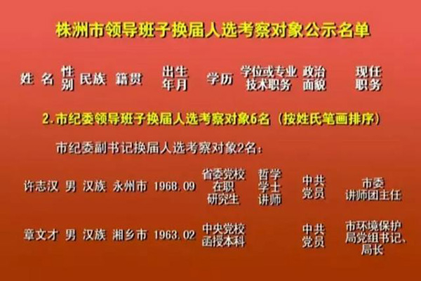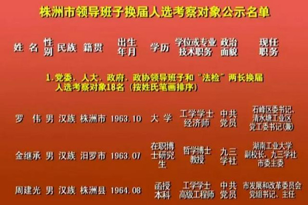 株洲市领导班子换届人选考察对象公示名单