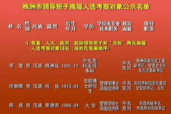 株洲市领导班子换届人选考察对象公示名单