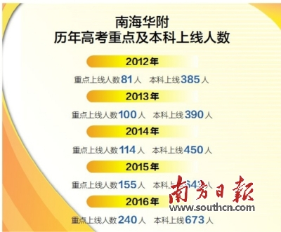 据笔者了解,作为广东省著名重点中学华师附中的分校,南海华附积极汲取华师附中本部培养尖子生的经验,并创建奥班(公费班),为尖子生的发展提供了优良的平台。在2005年至2015年期间,南海华附奥班共有1000多名学生考取了全国重点大学,其中有261名同学考入北大、清华、浙大、港大、复旦、同济等广东省外的顶尖学府;有616名同学考入中大、华工等广东省内知名高校。
