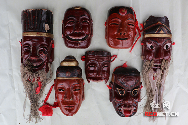 傩面具:从左到右,上排为土地公、挖路郎君、笑和尚、大法师公,下排为土地婆、架桥郎君(半截)、开山小鬼。(采集于荣华乡苏家坛)