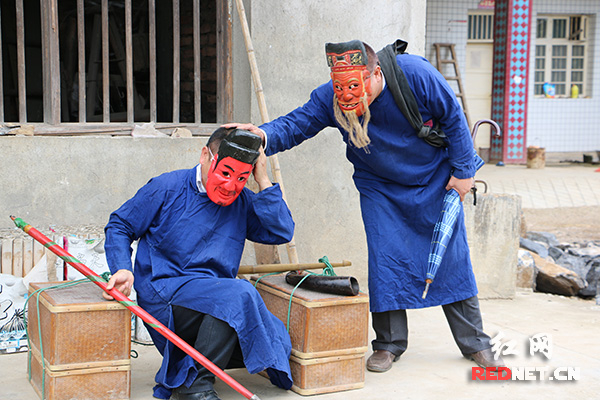 田坪镇阳家坛傩戏《萧师公》:萧师公在路途中诱导帮手唐六。