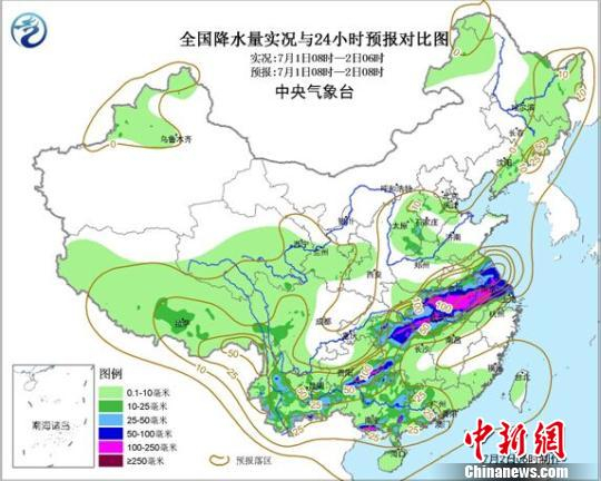 全国降水量实况与24小时预报对比图。 中国气象局成都高原气象研究所供图 摄