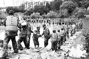 7月5日,湖北某预备役高炮师官兵在传递袋装石料,用于管涌处置围堰修筑。新华社发