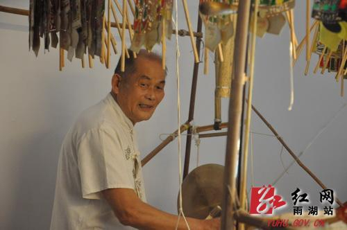 吴升平老人正在表演纸影戏。