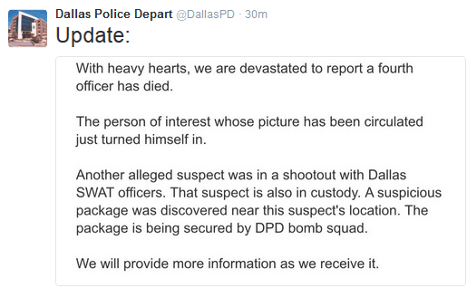稍早前,达拉斯警局曾公布一名嫌疑人照片,照片上该嫌疑人手持机枪。据警局介绍,目前该嫌疑人已经自首。另一名嫌疑人也被拘捕。