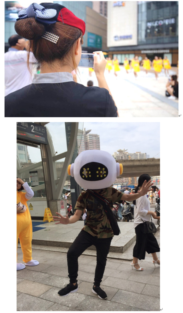 下午一点起,五一广场平和堂、星沙万象汇、金星路步步高三处人群聚集处突然响起音乐,数十名“芒果星人”四面八方闪电汇聚而来,踩着节奏跳起了憨态可掬的舞蹈,并随机向路人派赠包装精致的芒果。芒果盒子上还印有“芒果大本营“的官方微信号,不少拿到芒果的市民都纷纷拿起了手机扫描,一探究竟。这群宣称自己已经落户地球,安家芒果大本营的萌系芒果星人也引得围观群众竞相拍照合影,甚至还有路人加入共舞。