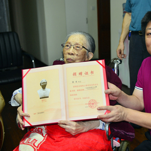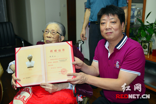 93岁的徐舟老人(左)收到捐赠证书。