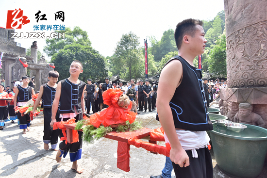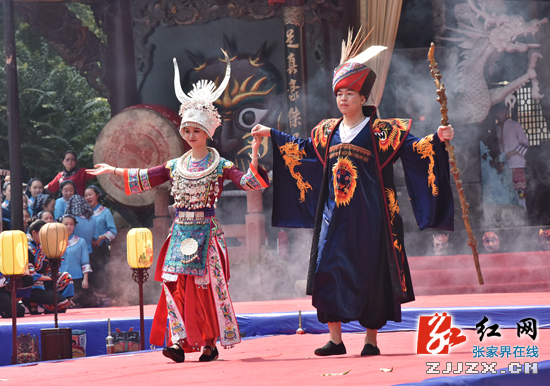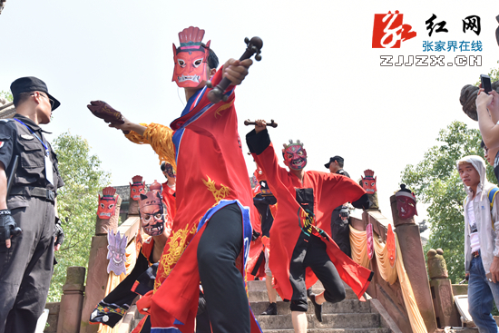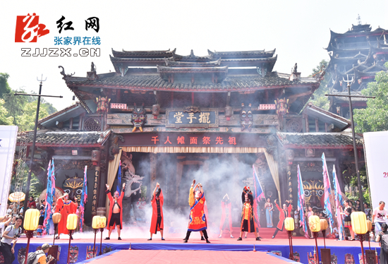 张家界民俗文化活动月开幕式活动,沿袭了土家千百年来农历六月六傩面祭祖的风俗,再现了“千人傩面祭先祖”的壮观场景,表达了对土家先祖的敬仰。活动中,以土家族民俗文化中的“晒龙袍”“泼龙水”“接龙气”等节目,展现了土家族人民劳动生活、民族服饰、爱国抗倭等场景,让国内外游客大开眼界。