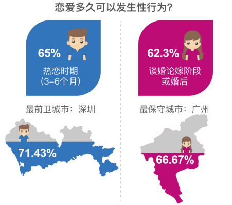 另外,深圳男性认同在热恋期阶段发生性行为的比例是全国最高的,达到71.43%,而广州女性最保守,有66.67%的女性认为起码要有要到谈婚论嫁阶段,或有婚姻保障后才可以发生性行为。同为一线城市,深广态度如此不同让人感到意外。