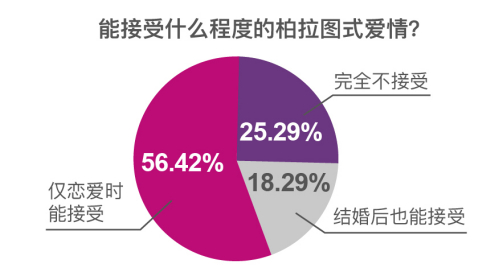柏拉图式爱情是注重内心世界的契合,摒弃欲望。对于欲望这个话题,调研中显示,尽管社会日新月异,对待性,男女的观念仍然有很大差别。65%的男性认为恋爱三个月到半年左右就可以接受发生性行为,62.3%的女性则表示至少需要到谈婚论嫁阶段,或结婚后才可以发生性行为。