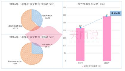 虽然相较于去年,女性白领更加舍得在“美丽”上花 钱,但数据显示,相较于去年同期,白领女性在包包上的 花费不升反降,包包在女性全部时尚消费支出中的比重从 去年的36.8%下降至25.6%。