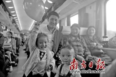 列车上的藏族乘客,孩子们开心地玩气球。