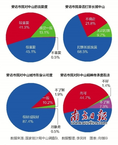 11日,国家统计局中山调查队(以下简称“国中调”)公布《满载正能量 实现新跨越——中山市民城市认可度评析》(以下简称“报告”)。国中调对206名市民的走访结果显示,九成受访者认可中山城市形象,七成受访者有长期发展打算;此外,九成受访市民认可孙中山精神在中山的传承情况。