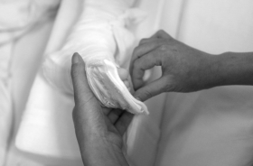 7月12日,中南大学湘雅二医院,婷婷因为在水上乐园玩耍受伤,爸爸正给她受伤的脚做按摩。 图/记者金林