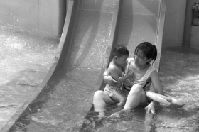 位于省森林植物园的乐民水上乐园,开放了五个水池,分为儿童池和成人池。家长可陪同进入儿童池,但禁止玩儿童的游乐设施,儿童不能进入成人池。每个水池旁配有量身高的标尺,旁边有安全员监管。安保人员的设置由水池大小决定。