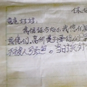 “爸爸妈妈,我保证今后不找您们麻烦,今后一概后果不找您们,吃住不找您们,高价费不要您们付,今后工作不找您们,以上出于自愿不被人强迫,当时我外公在场。