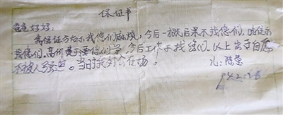 这张22年前的字条笔迹稚嫩:“爸爸妈妈,我保证今后不找您们麻烦,今后一概后果不找您们,吃住不找您们,高价费不要您们付,今后工作不找您们,以上出于自愿不被人强迫,当时我外公在场。儿:陈莹。”