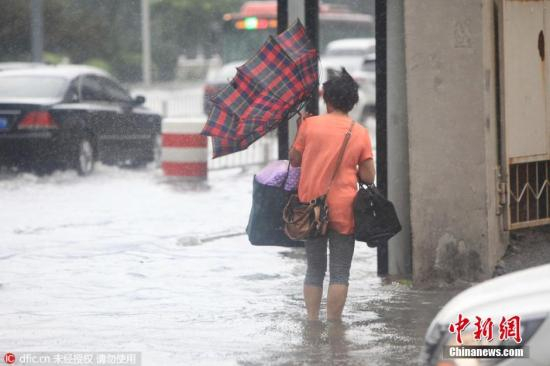 由于雨量较大,天津市区多个路段路面积水严重,车辆行驶缓慢,行人水前行,一些涵洞和过车地道因为积水严重中断交通。