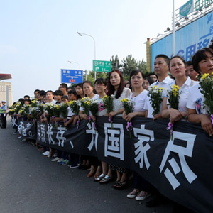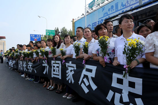 7月20日,许昌市民在马路旁迎接维和烈士李磊、杨树朋灵柩。新华社记者 曾涛/摄