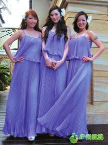 紫色的纱裙是明星婚礼常见的伴娘礼服,但却最常被吐槽,大S婚礼禁止媒体入场拍摄,也没有向媒体发布照片,宾客拍摄放出来的一些照片,简直是伴娘的“高级黑”,紫色吊带长纱裙,胸挤不出来,腿露不出来,更像一件随意的沙滩装,差评无数,但其实那来自一件国际品牌的设计。