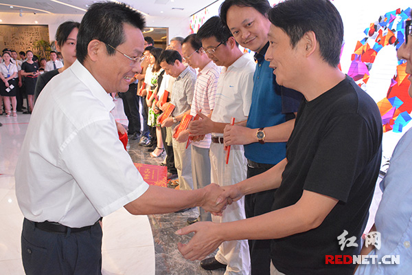 100位热心市民获评长沙规划展示馆“荣誉馆员”,长沙市城乡规划局党委书记、局长冯意刚(左一)为市民颁发证书。