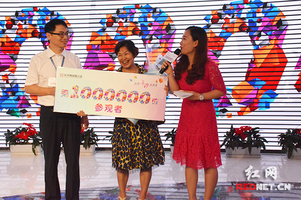 7月23日,老长沙石德纯(中)成为长沙市规划展示馆第100万名参观者,馆长吴海浪(左一)为其献上“大礼包”。