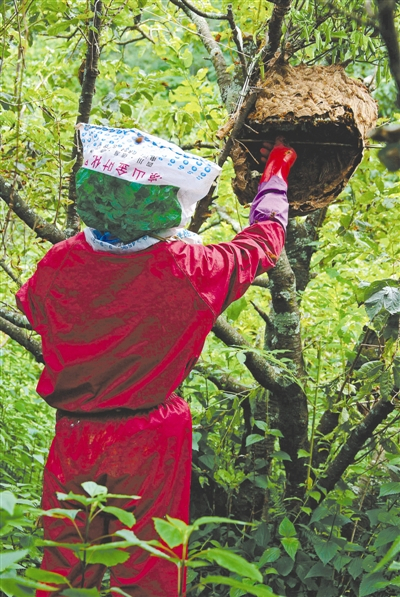 眼下,是第一批蜂蛹收获的季节。7月20日,52岁的村民李明松带上用口袋做成的简易头套及胶手套,拿着一把刀子走到屋前的果林中,找到一个脸盆大小的马蜂窝,准备取蜂巢。当他还没完全靠近,成百上千的马蜂拥而出,大肆攻击。