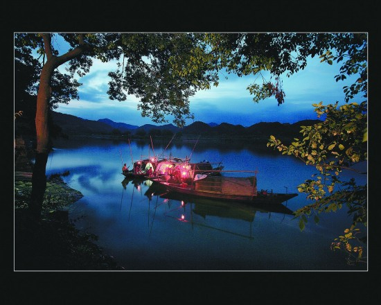 灯影桨声里,天犹蓝,水犹蓝。渔舟唱晚夜,青山外,绿野中,山野之外水天一色入画来。白鹭回首,雁过留声,荷花飘香,烟波浆声里,何处是江南?