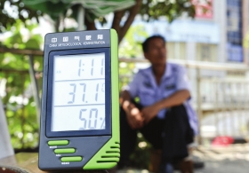 25日下午,记者刚进入报亭,一股热浪就扑面而来。记者把温度计放在摊前的报纸堆上,显示为40.5℃。陈阿姨每天在这里从早上6点工作到晚上11点,靠着电风扇微弱的热风避暑。