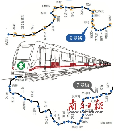 地铁9号线自南山区红树湾南站至罗湖区文锦站,全长为25.38公里,设站22座,其中9座换乘站。该线路跨南山、福田、罗湖三大最繁华的区域。