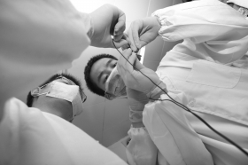 7月12日,湖南师范大学湖南省蛋白质组学与发育生物学重点实验室,研究人员正用电 流刺激蜘蛛以从鳌肢取得毒液。组图/记者金林