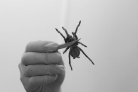 这套专业设备包括电刺激采毒仪、移液器、离心管、镊子、生理盐水、冰盒等,准备就绪之后,取毒开始了。彭德正从饲养盒里取出一只蜘蛛,用手指按住蜘蛛的8只脚之后,再用离心管对准蜘蛛的螯肢,这是蜘蛛喷射毒液的地方。