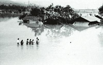 我是从水灾火灾中逃出来的,身上仅穿着一个蓝色裤头,系着一根皮带。惊魂未定时,看到了感人的一幕,也听到了一件让人寒心的事情,但这终究是一个事实:大火在水面熊熊燃烧时,与我家相邻不远的一对父子,在这里上演了一幕催人泪下的故事:父亲在逃生中不会游泳,儿子急忙用两根杉木让父亲双臂夹着,自己从后边推动,一点一点,逆水向着朝阳门游动,场面十分感人;而与他们相邻更近的另一对父子,据说在大火来临之时,其父也不会游泳,儿子只顾自保性命。他迅疾一个猛子扎进了水,匆忙地向安全地带游去,所幸大火燃烧时是退水,雨借风势,很快大火就被控制住了。在灾难面前,人的求生欲望是本能的,在特殊情况下于情于理有些无奈。通过这场洪水的灾难,三十年过去了,留给我们的是许多值得思考的事情。