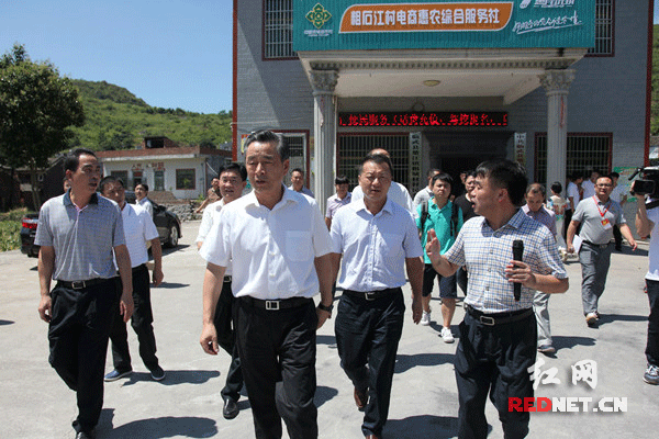 7月29日,湖南省副省长戴道晋(前排左二)在临武县楚江镇粗石江村电商惠农综合服务社视察调研。