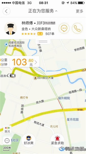 行驶至成都绕城高速上时,胡女士手机上显示车费为80多元。“当时,他问了我手机上显示多少钱,之后,他说软件计费有问题,不能亏着跑,让我加价100元。”胡女士说,她未同意司机要求,之后司机便开始减速行驶。“刚出发时能跑100码左右,减速后只有60码。但是车比较多,我也没说什么。但之后司机更慢了,我看到仪表盘上显示只有40码。”