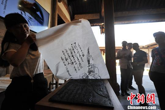 图为四堡仅有两位雕版技艺代表性传承人之一的马力向记者展示历时3个月创作的《兰亭集序》雕版,并现场演示上墨、覆纸、印刷等一道道雕版印刷工序。 张斌 摄