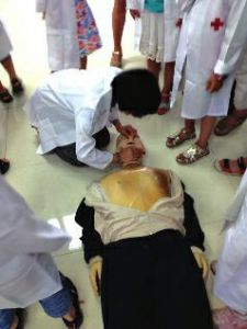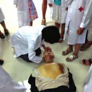 王勃在医学假人身上边演示边讲解:“心肺复苏时要将患者放在开阔的硬地面或木板上,如果患者口里有异物,要用手将异物清除掉;解开患者的衣服和裤带,立即在两乳头连线的中间段进行按压,按压时,双手重叠,靠身体的力量进行按压,双臂不能打弯,手掌也不能离开患者身体。按压应做到每分钟100次以上,按压深度成人患者应达到5~6cm,按压30次后,将患者头部尽量向后仰,使下巴上仰的角度尽量与地面垂直,打开气道,帮患者呼吸;直到120的医生赶到,或患者恢复心跳及自主呼吸时为止。”