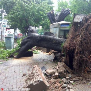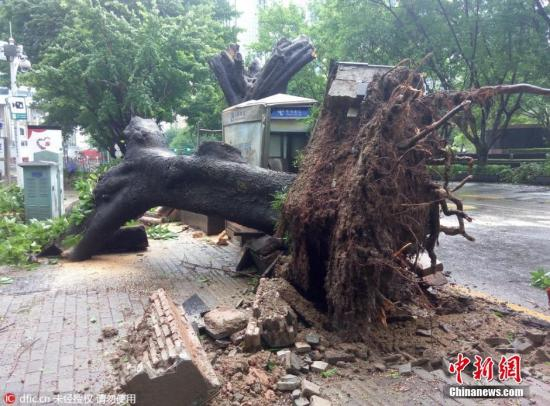 资料图:2016年8月2日,台风“妮妲”以强台风级别,于3时35分在深圳大鹏半岛沿海地区登陆,登陆时中心最大风力14级,所过之处,破坏力惊人,位于解放路一路段的一棵大树被连根拔起倒地,横亘路边,上午9时许,倒下的大树已被环卫工人截断清理。图片来源:东方IC 版权作品 请勿转载