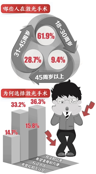 从手术的追求来看,因应征入伍进行手术的占33.2%,因升学和公考的占36.3%,因考警校和飞行员的占14.7%,因自身希望美观和方便的占15.8%。