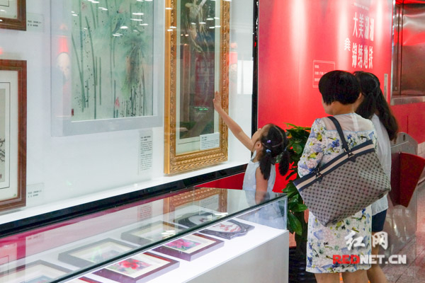 小朋友被展出的湘绣作品所吸引,问着妈妈各种问题。