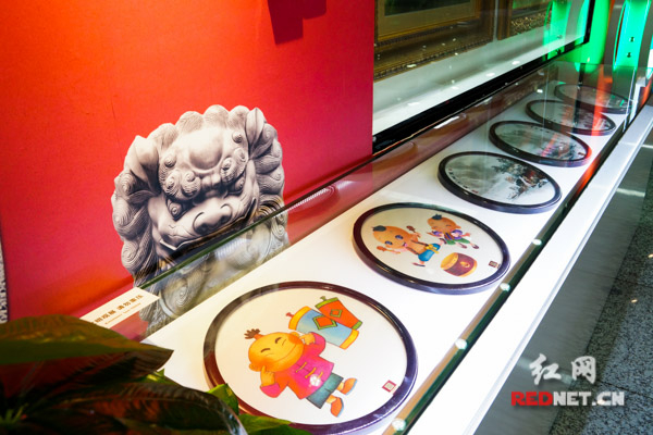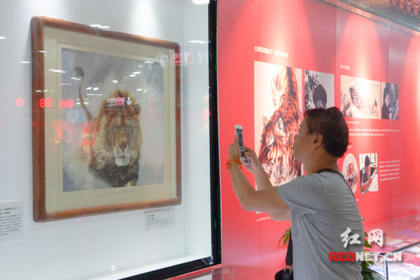 在红墙黄瓦的衬托下,湘绣手帕、湘绣挂画、湘绣丝巾等精美湘绣工艺品陈列展位,作品间还配有湘绣历史、刺绣推广人物等介绍。精美的湘绣作品不仅展现了“刺”客们高超的技艺,还被赋予了美好的寓意。一幅名为《雄狮》的作品吸引了观展群众的注意,绣画中的狮子刚健明快、气势磅礴,“狮”与“事”谐音,以此来表达遇事总能顺心如意。