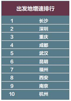 出境旅游人数增长速度最快的前10名城市分别为长沙、深圳、重庆、成都、武汉、昆明、福州、西安、南京、杭州。其中,长沙等城市,在线出境游客人数增长超过100%。
